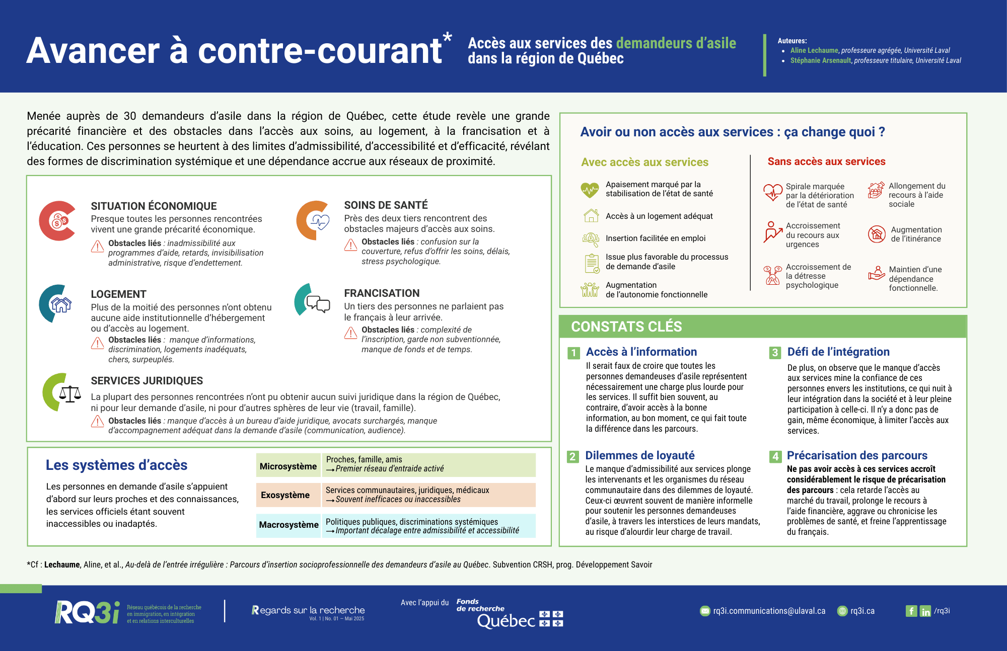Que se passe-t-il après l’arrivée des personnes demandeuses d’asile à Québec ? À travers des entrevues menées dans la région, cette étude donne la parole aux personnes concernées afin de mieux comprendre leurs parcours d’accès aux services. L’analyse révèle un système complexe, souvent opaque, dans lequel les individus doivent naviguer seuls, exposés à des refus, à la bureaucratie et à l’isolement. Les chercheures mobilisent un modèle interculturel systémique pour démontrer que, faute de soutien institutionnel, les personnes sollicitent essentiellement leur réseau personnel — une stratégie qui, paradoxalement, freine leur intégration durable.