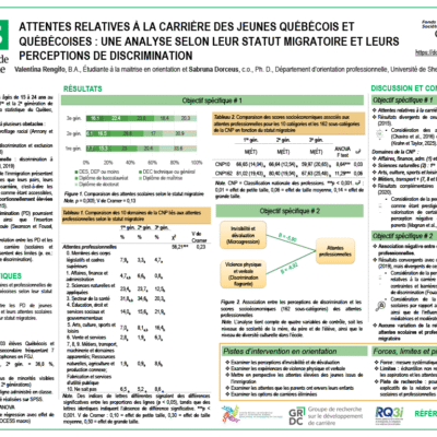 Les recherches en développement de carrière suggèrent que les perceptions de discrimination (PD) influencent les choix professionnels des personnes issues de la diversité, dont celles issues de minorités visibles (Swanson et Fouad, 2020). Ces perceptions limiteraient les options professionnelles envisagées (Poon, 2014 ; Schneider et Dimito, 2010), alimenteraient des perceptions négatives des opportunités professionnelles (Conkel-Ziebell et al., 2019 ; Goldberg et al., 2021) et atténueraient les attentes scolaires et professionnelles (Abrahamsen et Drange, 2015). Toutefois, peu d’études dressent un portrait systématique des PD chez ces jeunes ni n’examinent leur lien avec les attentes de carrière selon le statut de minorité visible.