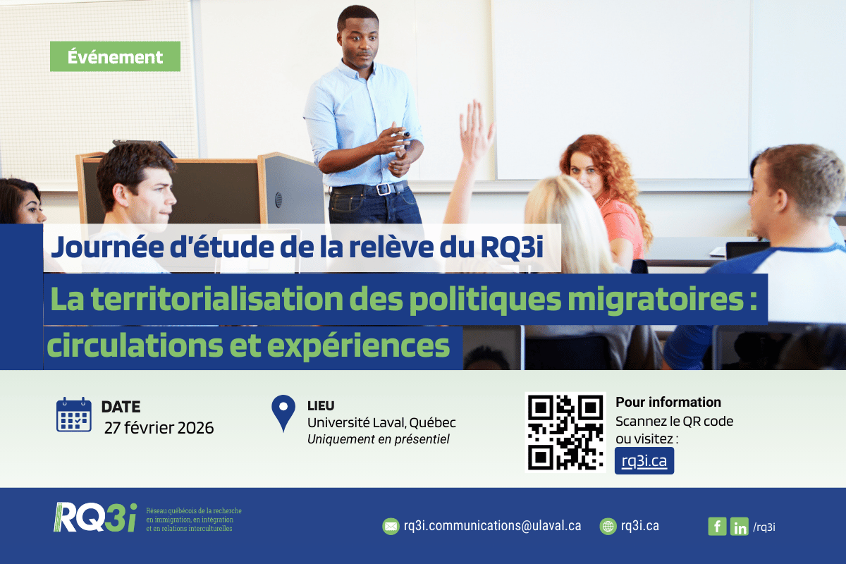 Le Comité de la relève du Réseau québécois de la recherche en immigration, en intégration et en relations interculturelles (RQ3i) organise cette année sa première journée d’étude de la relève, qui se tiendra le vendredi 27 février 2026 à l’Université Laval.