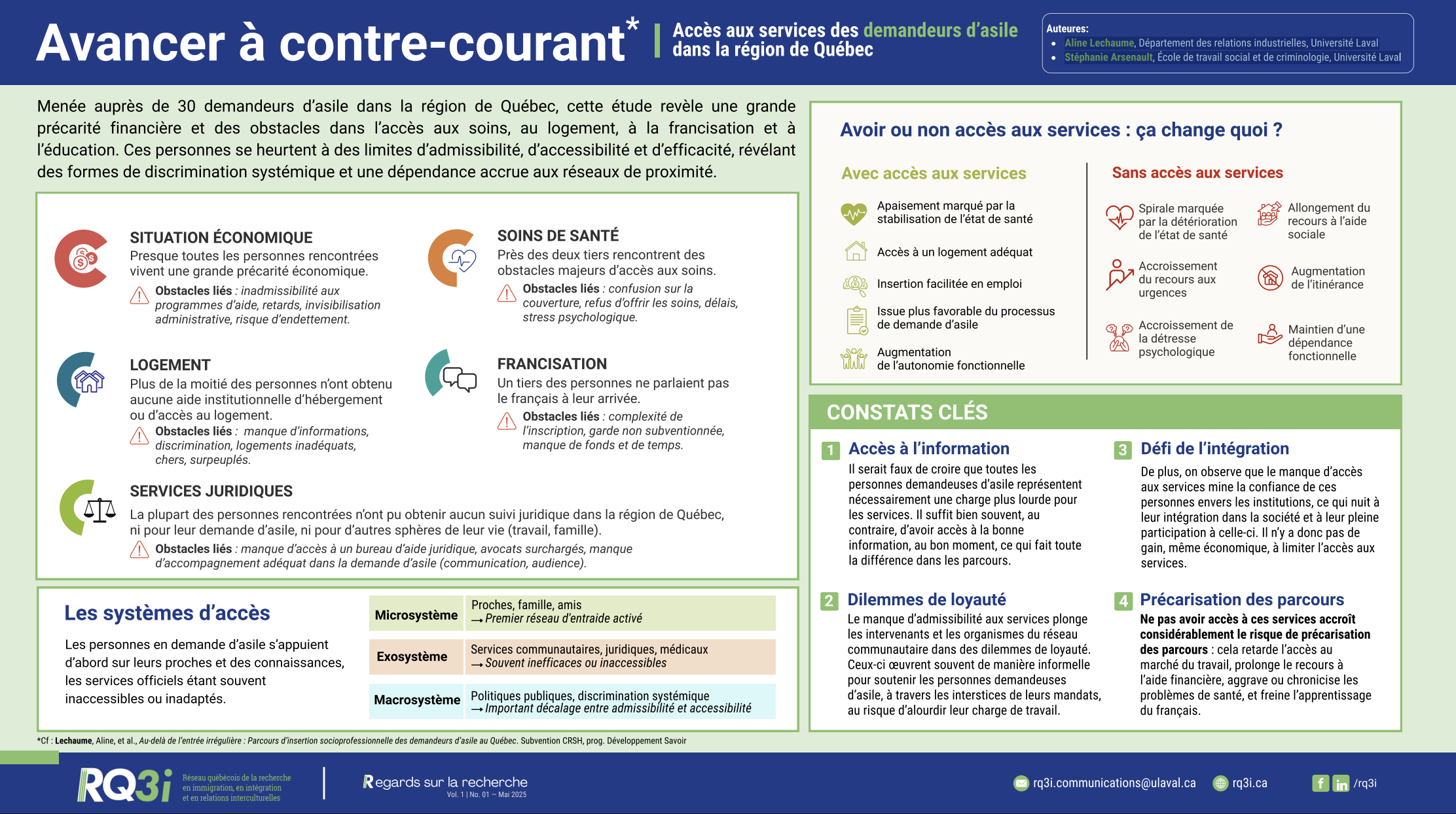 Que se passe-t-il après l’arrivée des personnes demandeuses d’asile à Québec ? À travers des entrevues menées dans la région, cette étude donne la parole aux personnes concernées afin de mieux comprendre leurs parcours d’accès aux services. L’analyse révèle un système complexe, souvent opaque, dans lequel les individus doivent naviguer seuls, exposés à des refus, à la bureaucratie et à l’isolement. Les chercheures mobilisent un modèle interculturel systémique pour démontrer que, faute de soutien institutionnel, les personnes sollicitent essentiellement leur réseau personnel — une stratégie qui, paradoxalement, freine leur intégration durable.